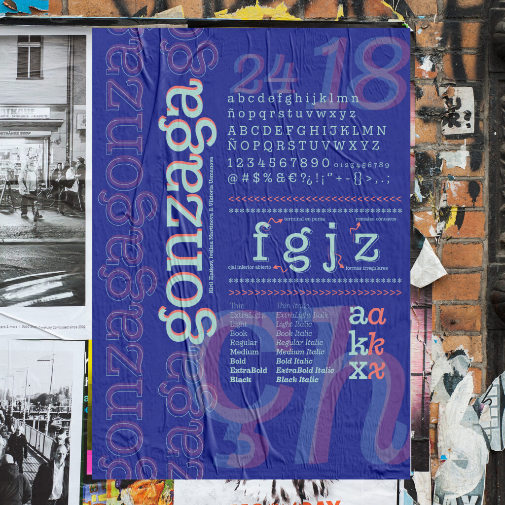 Design of a typeface family with a strong editorial character, designed for titles with personality and legible body text. The specimen highlights its contrasts, irregular shapes, and open lower case, characteristics that give it dynamism and uniqueness.