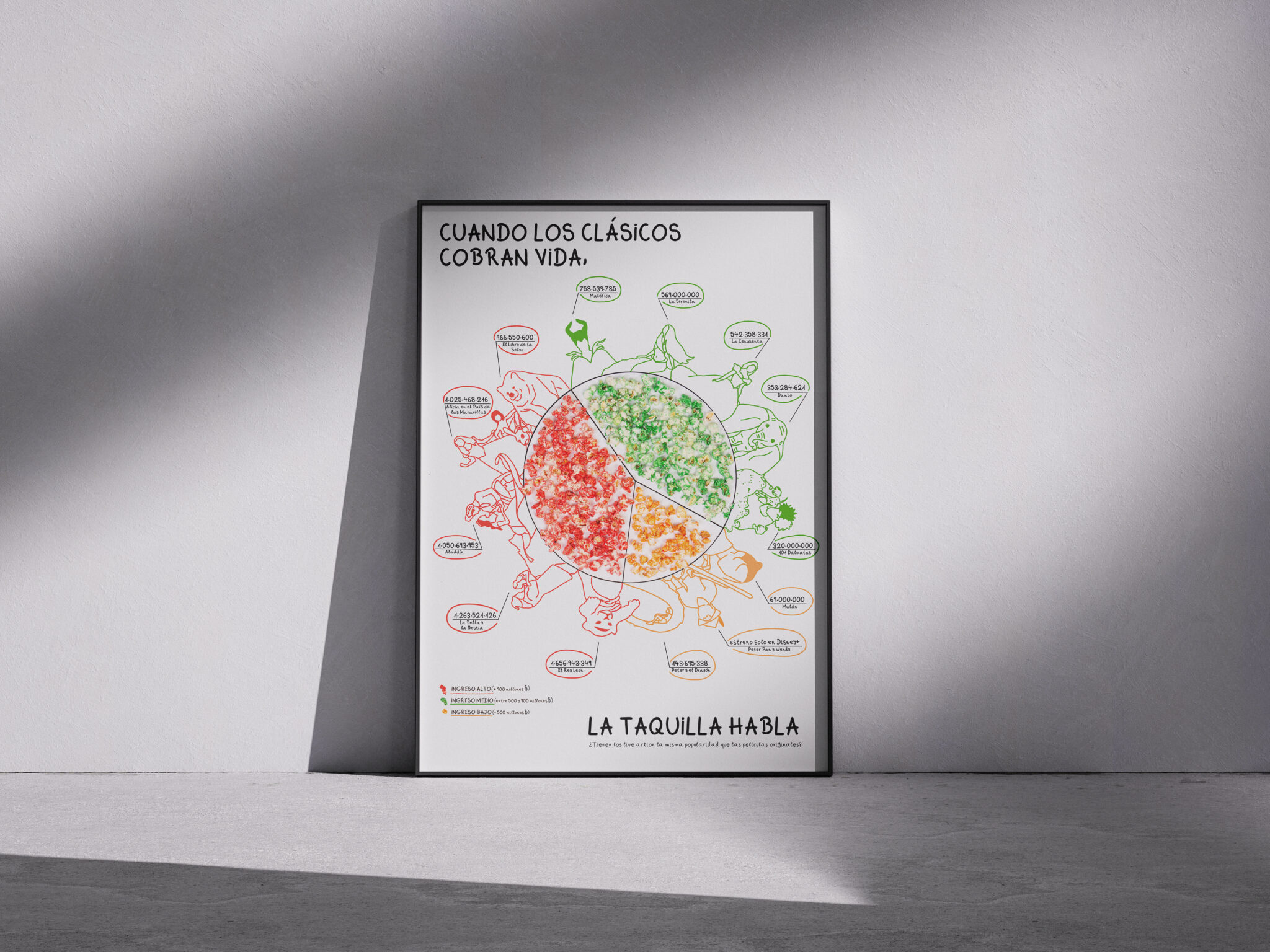 Illustrated characters surround the pie chart, connecting each film with its box office performance, to ask: Does reviving a classic guarantee the same success?